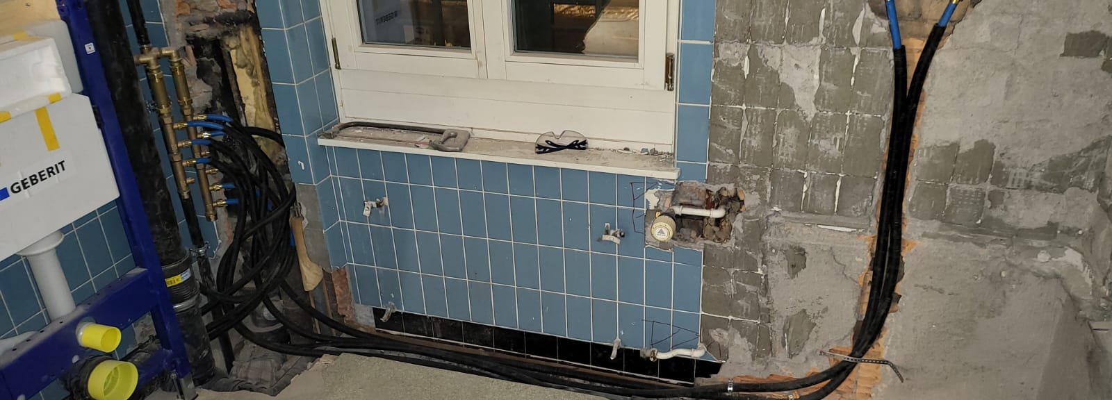Die geöffnete Wand zeigt die präzise Vorbereitung der Sanitärleitungen. Hochwertige Komponenten und eine fachgerechte Installation bilden hier die Grundlage für ein zuverlässiges, langlebiges Badezimmer.