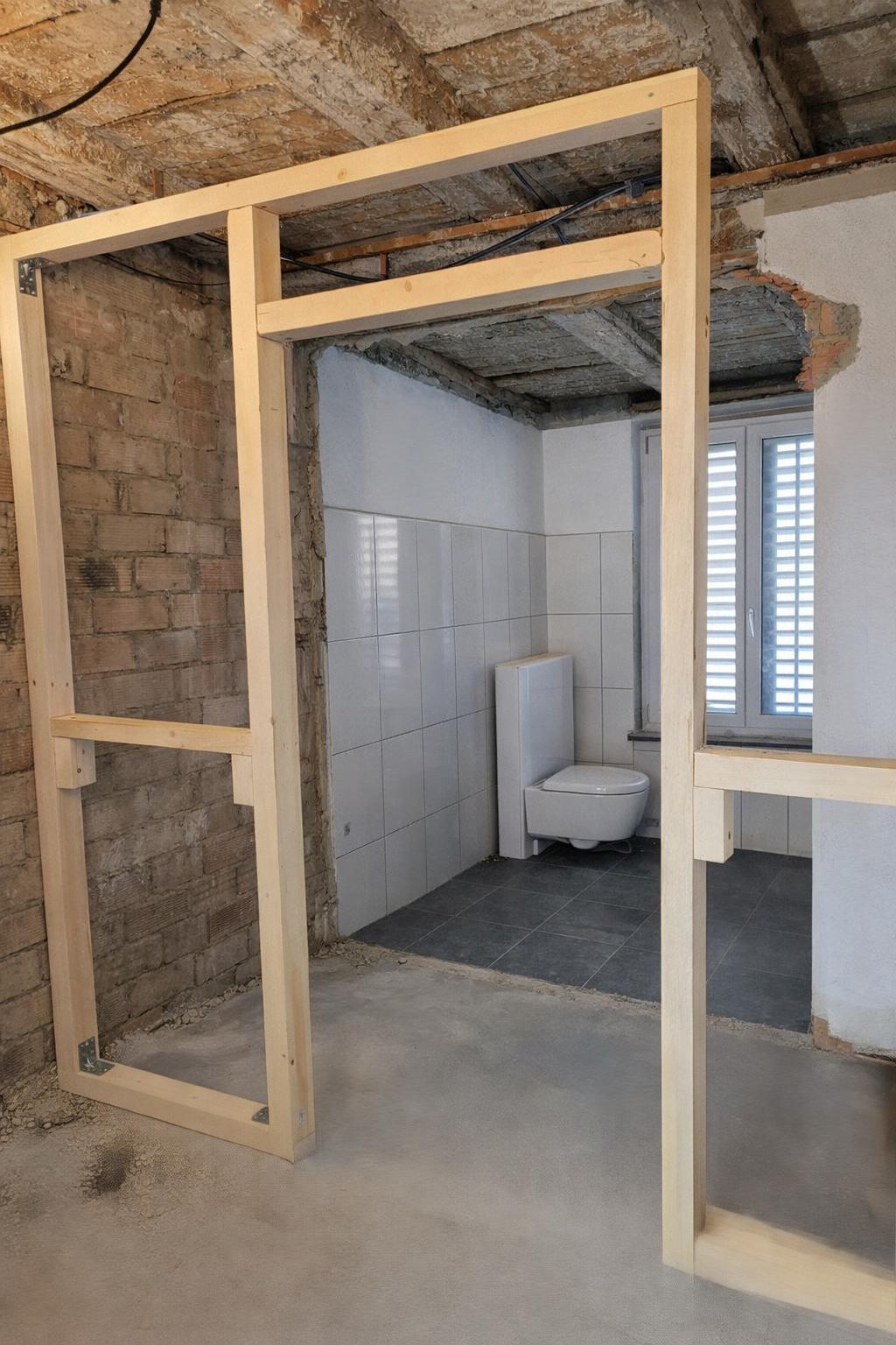 Die Aufnahme zeigt den Aufbau einer neuen Wandkonstruktion. Offene Leitungen, sichtbare Tragstrukturen und präzise Vorbereitungsarbeiten bilden die Basis für den weiteren Innenausbau und eine langlebige, saubere Umsetzung.